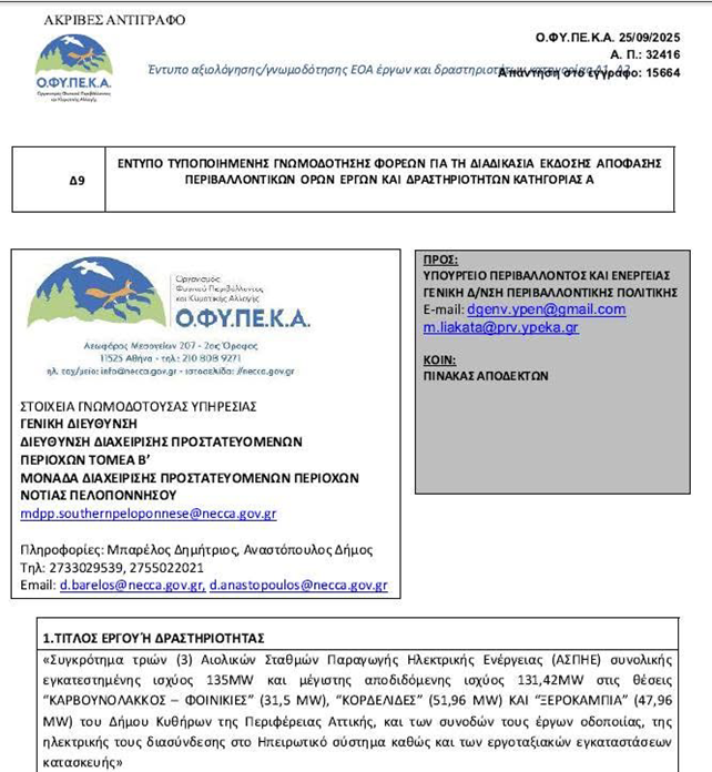 Ο Οργανισμός Φυσικού Περιβάλλοντος και Κλιματικής Αλλαγής (ΟΦΥΠΕΚΑ) γνωμοδότησε αρνητικά για το ΣΥΓΚΡΟΤΗΜΑ ΤΩΝ ΤΡΙΩΝ ΑΙΟΛΙΚΩΝ ΣΤΑΘΜΩΝ ΤΗΣ ΤΕΡΝΑ ΕΝΕΡΓΕΙΑΚΗ. Η γνωμοδότηση αυτή είναι ιδιαίτερα βαρύνουσας σημασίας.