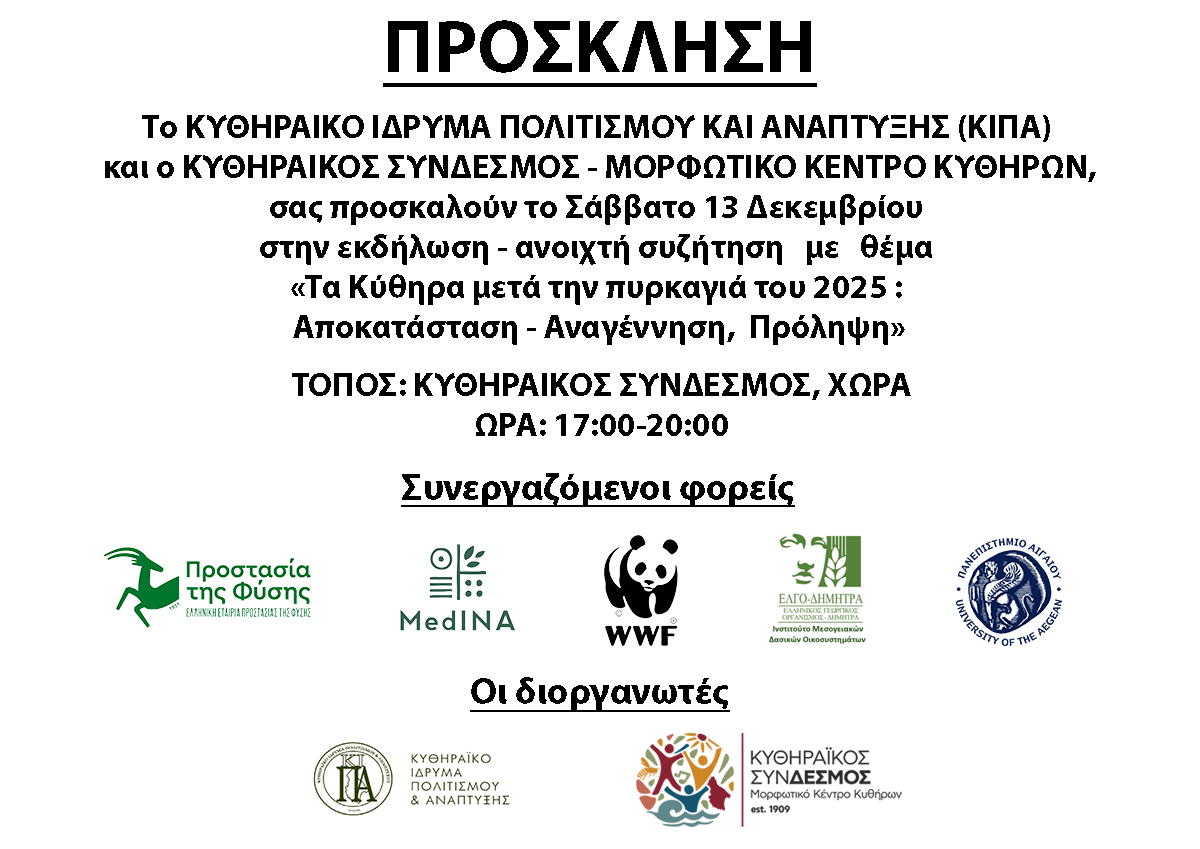 Διαβάστε Περισσότερα →Εκδήλωση ενημέρωσης και ανοιχτής συζήτησης με τίτλο: «Τα Κύθηρα μετά την πυρκαγιά του 2025 : Αποκατάσταση – Αναγέννηση, Πρόληψη»