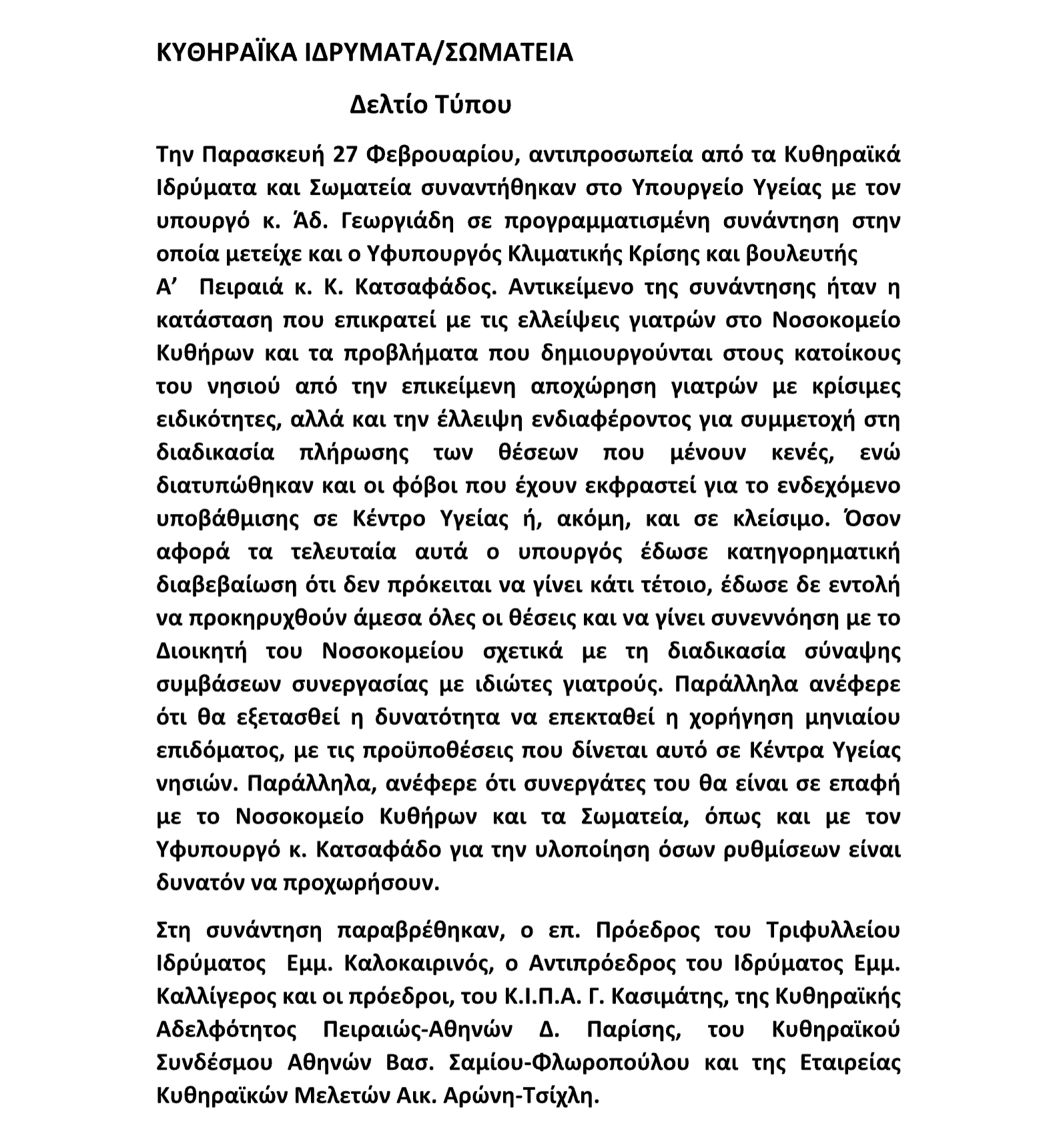 Συνάντηση Κυθηραϊκών Ιδρυμάτων & Σψματείων με τον Υπουργό Υγείας για το Νοσοκομείο Κυθήρων